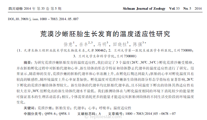 为研究荒漠沙蜥胚胎发育的温度适应性”我们设定了3个温度(26摄氏度,30摄氏度,34摄氏度)孵化荒漠沙蜥受精卵,并在胚胎孵化过程中对胚胎代谢和心率、新生幼体的形态学特征和幼体静止代谢率的温度适应性进行了研究( 结 果显示”随着卵的发育”荒漠沙蜥的胚胎代谢率和心率逐渐上升”在孵化后期达到最大;胚胎的心率对孵化温度具有 较高的敏感性”随环境温度上升心率显著加快( 孵化温度对荒漠沙蜥新生幼体的部分形态学指标有显著影响”!)26摄氏度下孵化的荒漠沙蜥幼体体型较大( 新生幼体的代谢率均比胚胎代谢率高”且不同温度下孵出的幼体其热适应性有 较大差异”‘”30摄氏度组孵化出的新生幼体代谢水平最低( 我们推测幼体在与孵化温度相同的环境下消耗较少的能量便 可保证基本的生理活动需求。相反,个体需要消耗更多的能量才能适应从胚胎到幼体的不同生活史阶段的环境温度变化。