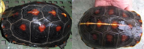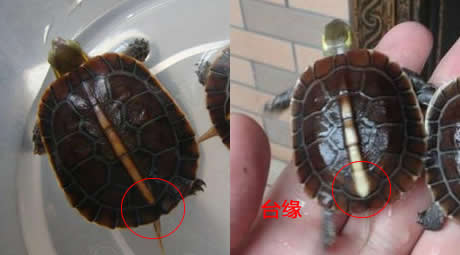 6.苗子通常不容易区分(因为部分大陆缘小时候脖子有成块的黑色或褐色),通常台缘尾部最后一块遁甲上的背线末端成模糊的圆形,大陆缘通常是线形!而且台缘苗背线低且接合部分模糊,无法用手捏住,大陆苗则多数背线清晰且高耸连贯!