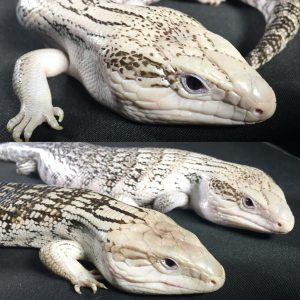 Fourth on the list are Black Eyed Anery Blue Tongues which in simple terms are the opposite in appearance to albinos in that they are void of all oranges, reds & most yellows with a result of leaving just black & white scales in a variegated arrangement. One of the most striking characteristics of this mutation are the jet black eyes which are a result of the standard orange pigment being genetically removed from the iris. This morph was discovered by myself in a line of Kimberley Blue Tongues from a normal wild type pairing. By itself can vary from simply stunning to moderate but in combination with other morphs can & does as we’ll discuss later have astonishing results. Of further note there is another line of Black Eyed Anery Blueys that have since been proven by Beck Drescher in a line of Darwin locality animals with both lines having what appears to be a straight forward recessive mode of inheritance.