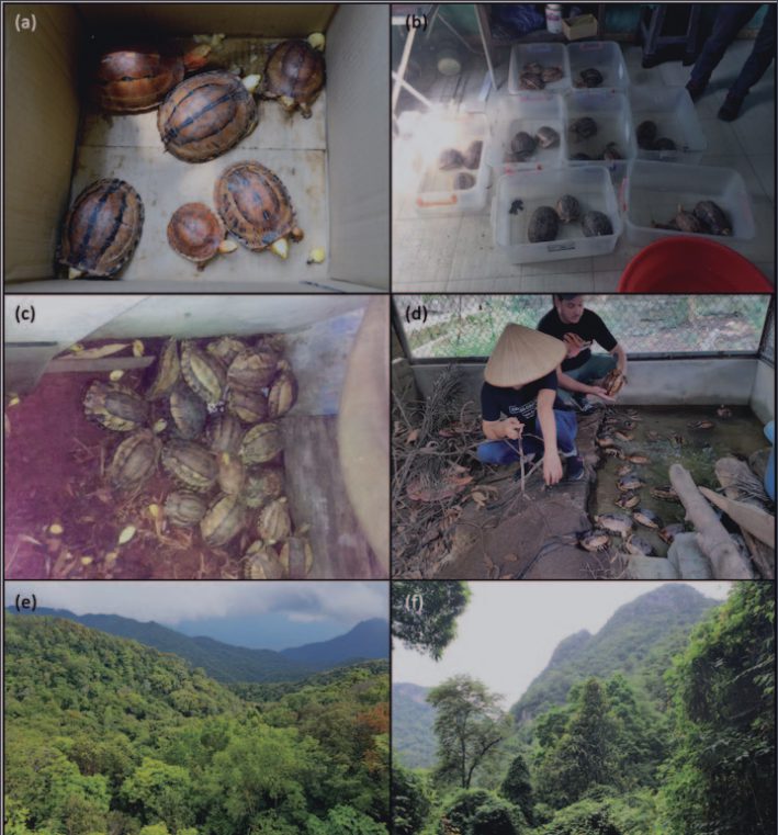 没收的黑腹闭壳龟,并于2018年将其转移到河内野生动物救援中心(d)。