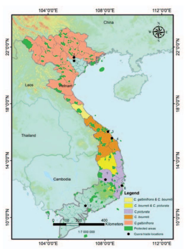 地图也显示了黄额闭壳龟在越南的分布范围及各个亚种的分布地区和重叠区域。