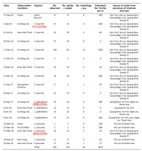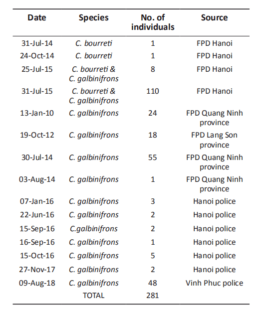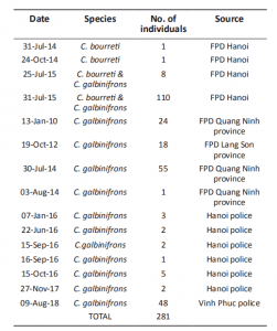 △表2.在2010-2018年期间,没收并转移到越南河内Soc Son救援中心的黄额闭壳龟数量。