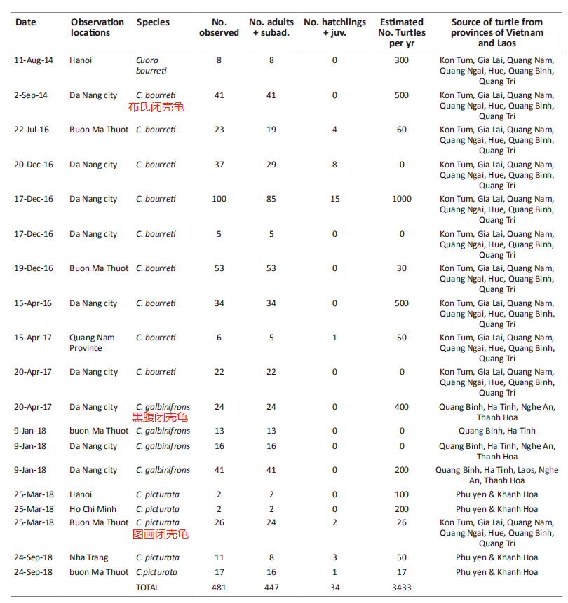 以上就是本次投稿所翻译的内容了,原文章链接放在这里,需要的朋友可以自行下载 (http://www.turtle-sanctuary.org/wp-content/uploads/2019/07/Observations-of-threatened-Asian-box-turtles-Cuora-spp.-on-trade-in-Vietnam.pdf)