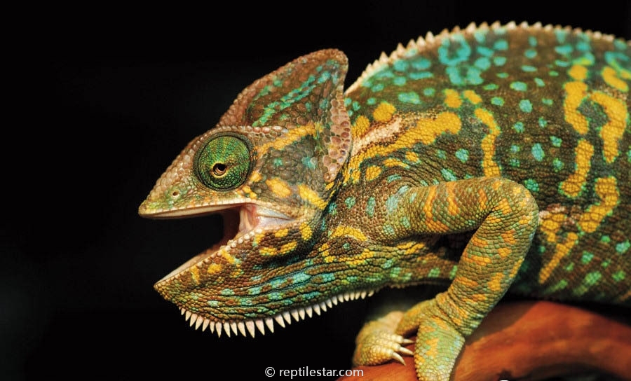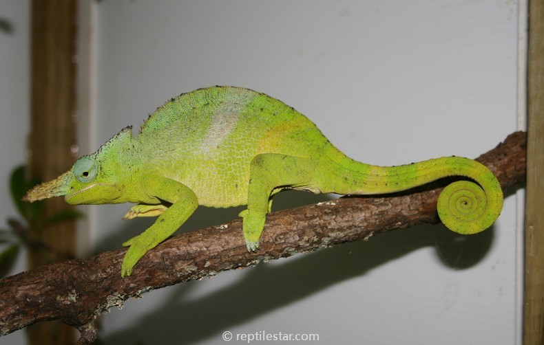 每年通常只产卵一次,大多数亚种的雄性个体与高冠变色龙一样在后脚跟有肉瘤凸起。交配后约90天左右雌性会产下25-50颗卵,浮华温度通常为:22-23度。经历约9-12个月后孵化。初生幼体约4-5公分,经过大约9-12个月就可以成年。