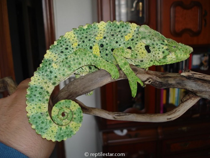 地毯变色龙属于体型比较小的树栖型变色龙,三个亚种中最大的体长可以长到36公分。它们也是少数雌性的体色优于雄性的变色龙!地毯变色龙的命名其实描述的是雌性变色龙怀孕期间的颜色。雌性在怀孕期会展现出华丽无比的色彩,这个时期雌性的体色要比雄性来得惊艳的多!