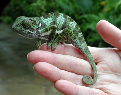 喷点变色龙属于小型树栖型变色龙,适应温度范围:摄氏22-28度。原产于非洲中部与南部诸国,主要栖息于热带莽原及雨林区,体长大多12-16公分!