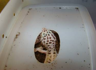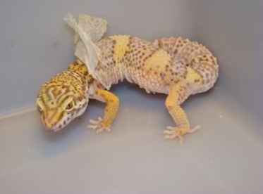 通常,豹纹守宫能够很容易的自行完成蜕皮,但是有些时候也会出现一些小问题。尤其是在它们蜕皮的时候没有足够的湿度,所以在它们蜕皮完成后你需要检查它们的蜕皮状况。豹纹守宫经常会在足趾的部位出现蜕皮不畅,出现这样的情况,你可以用把豹纹守宫四肢以下的部分用温水浸泡,几分钟后取出,再小心的人工帮它去除没有蜕干净的地方就可以了。如果被忽略的话会导致脚趾坏死断裂。虽然这不是大问题,它会很快的痊愈,但我认为能够保持身体的完整对你我和对它都会是一件愉快的事情。