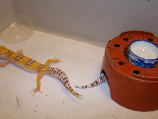 豹纹守宫是夜间活动的动物。在野外,白天它们喜欢躲在石块的下面或是岩石的缝隙中,天性使然,在人工环境里我们也需要为它添置一些这样的场所供其躲藏。材料几乎可以是你身边的任何东西——用完后纸巾的卷筒、盆栽移盆后的花盆、小的纸板盒、吃完后的冰激凌盒,所有身边的东西都可以有效利用起来。相同的地方是上述材料需要你帮它们开辟一个足够它们自由进出的洞口。就是这么简单。