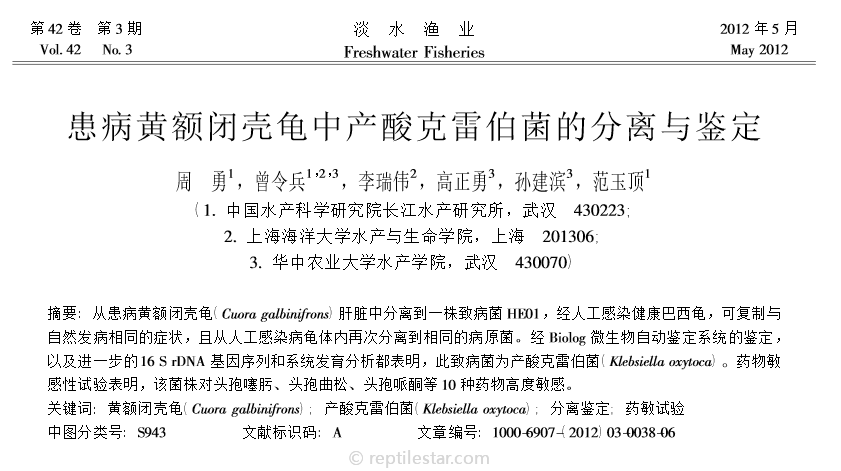 该资料来源网络,请尊重作者论文成果。仅供学习讨论,请勿用作商业用途! 点击下面的图片查看PDF: 《患病黄额闭壳龟中产酸克雷伯菌的分离与鉴定》 分类: 健康和疾病半水龟 Tags: 克雷伯菌病理闭壳龟黄额 Jam Sheng ReptileStar站长、爬行动物爱好者