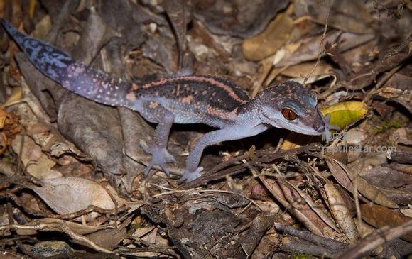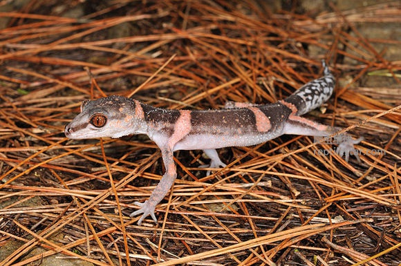 灰褐色底色+淡粉色条纹,一般琉球睑虎有两种花纹模式,横纹和直纹。尾巴特征也非常明显,呈无规则雪花状分布。