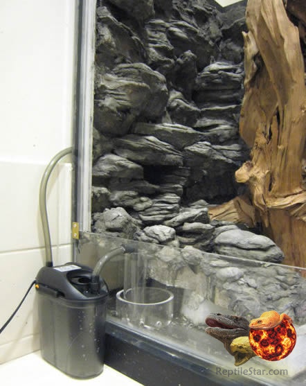 接下来在海绵预留的抽水位置放置防止泥沙吸入的亚克力隔离圈,这里使用了外置滤筒作为水泵(直接使用水泵在海面下面也可以,但是水泵发生问题更换可能会破坏植物和造景效果),将进水管固定好位置后出水管放置于背景板雕刻的流水源头处。