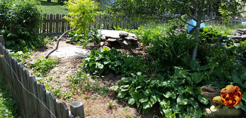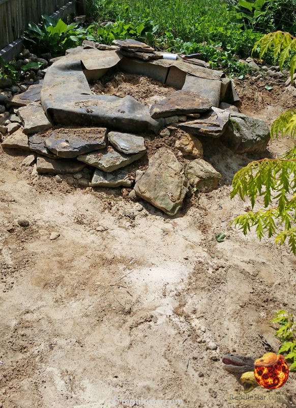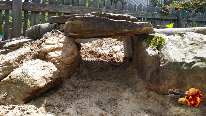 首先作者最引以为豪的布置!祭祀台?其实这个是菠萝包睡觉的闺房,四周用石片搭建起来,也用到了一些防水布,下雨的时候上方的洞会保存很多的水,满足了闺房对湿度的要求,后期使用一块大型石片将其掩盖,能够很好的保证夜间温度。老外的审美和动手能力确实值得借鉴!