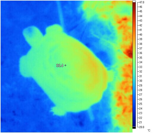 下面是陆龟在典型防爆太阳灯,环境温度为22摄氏度的热分布图: