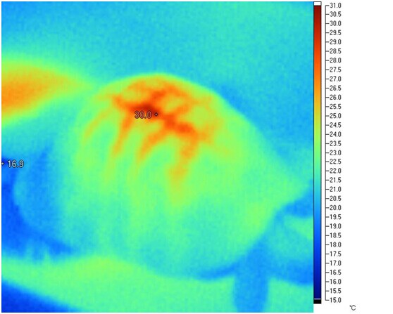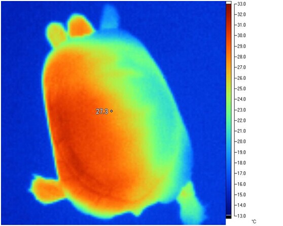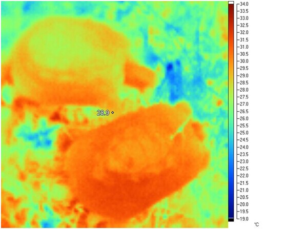 图中我们发现只有相对较小的区域是热的,与此同时剩余的甲壳和皮肤区域依然低于18摄氏度。