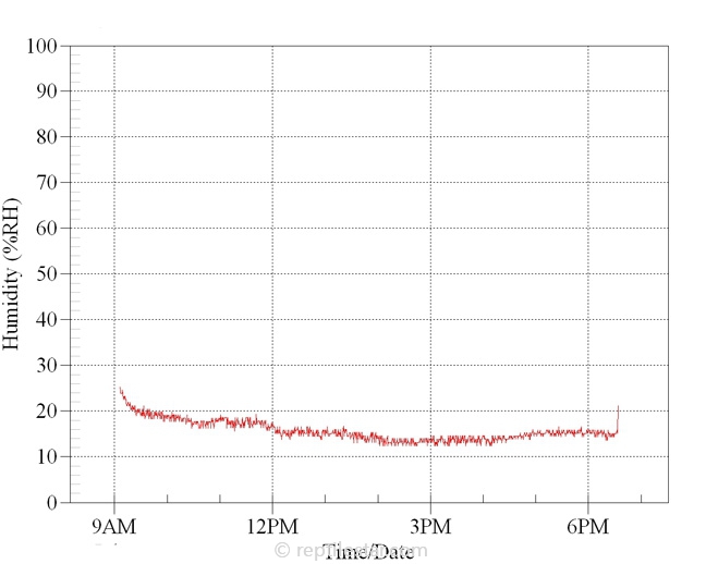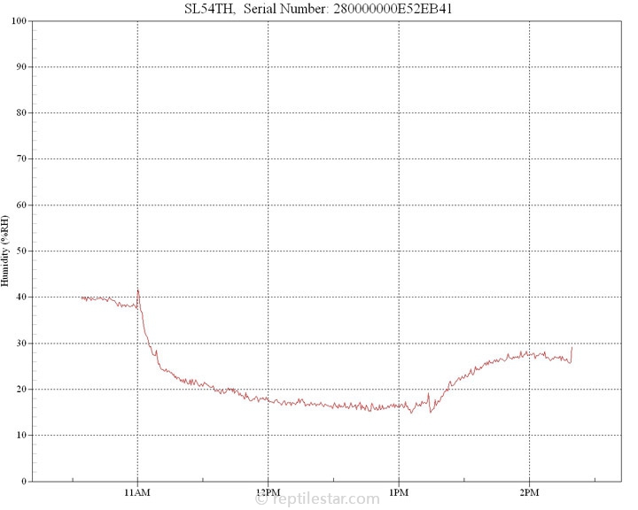 我们可以看出,加温环境(采取普通日灯加温,使用陶瓷灯具湿度更低)中,湿度如上图显示,长期保持20%以下,这个湿度值甚至低于沙漠型陆龟需要的湿度(沙漠中的陆龟会在湿润的洞穴中度过大部分炽热的温度)。