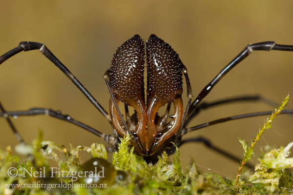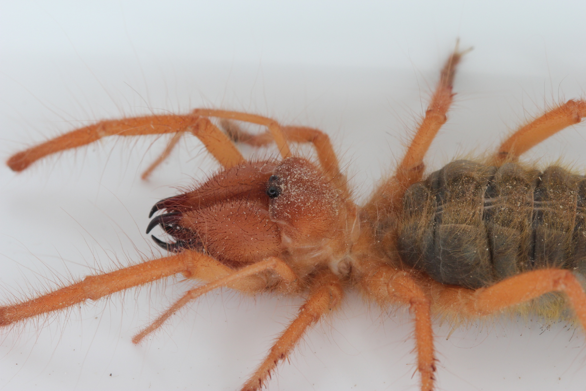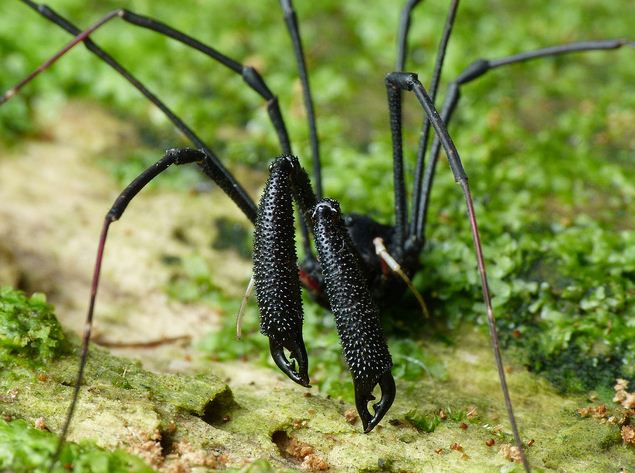 这是盲蛛里一个螯肢发达得离谱的栗子,但很好地展示了蛛形纲通用的身体模板:最前端是一对钳子一样的螯肢,两侧是一般来说很细小的须肢,然后是4对步足。大部分盲蛛的螯肢没有这么大,很难看清楚。