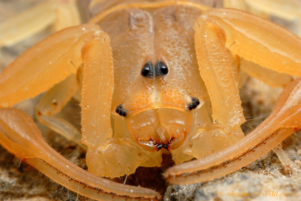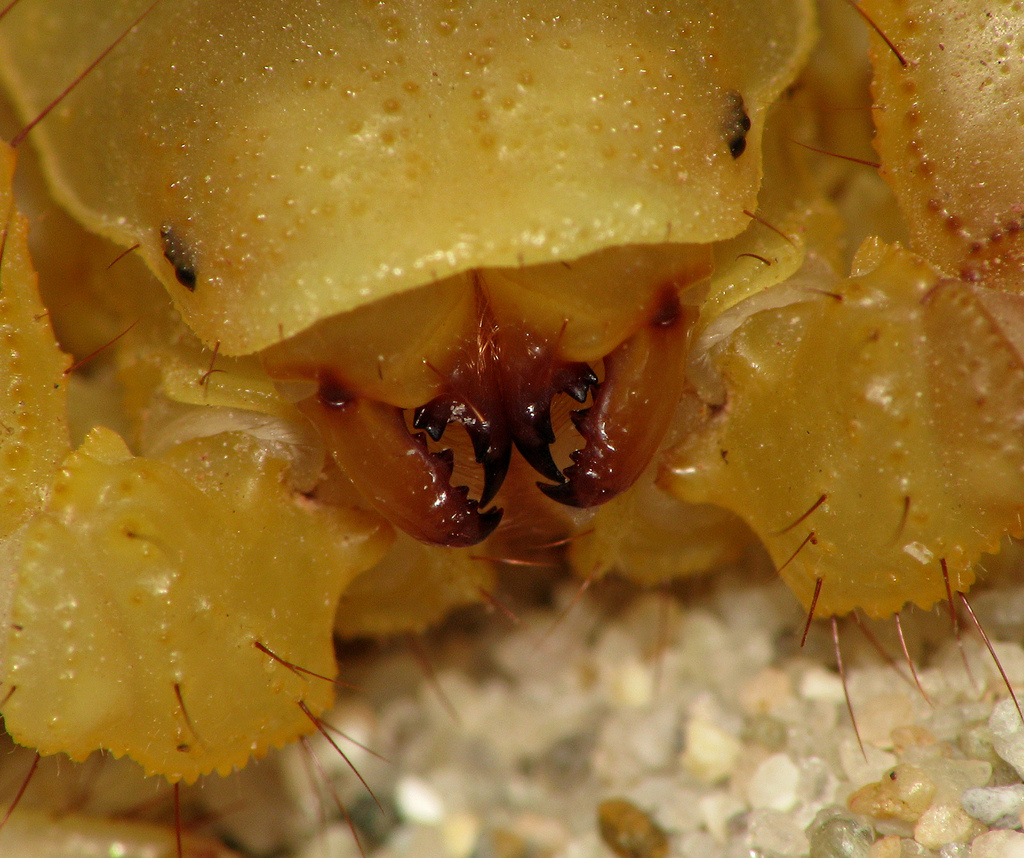 而蝎子的螯肢在两只大钳基部中间,相当于嘴的位置,用于进食: