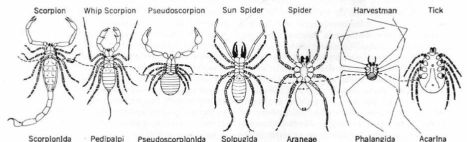 这张图显示了蛛形纲一部分类群附肢的同源性,黑色是螯肢,白色是须肢,打点的是步足;虚线是胸腹分界线。