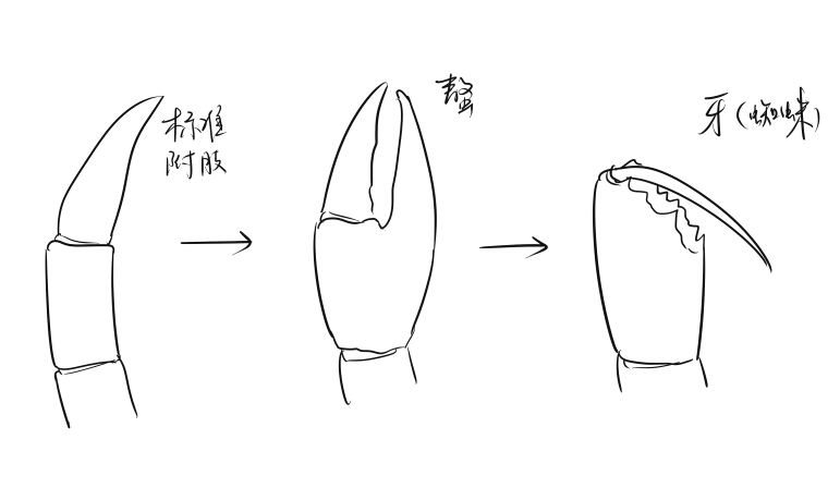 至于节肢动物的附肢为什么能一次次独立演化成螯,这没什么稀奇的;螯肢其实是附肢一个非常基本的突变,很容易实现。我画个简单的示意图: