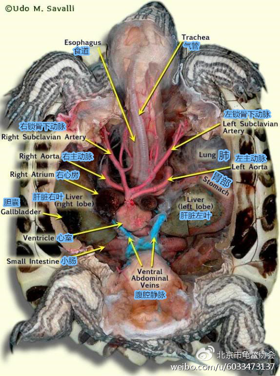 龟下呼吸道解剖图,其中Trachea为气管,Bronchi为支气管,Lungs为肺,Faveoli为肺小凹