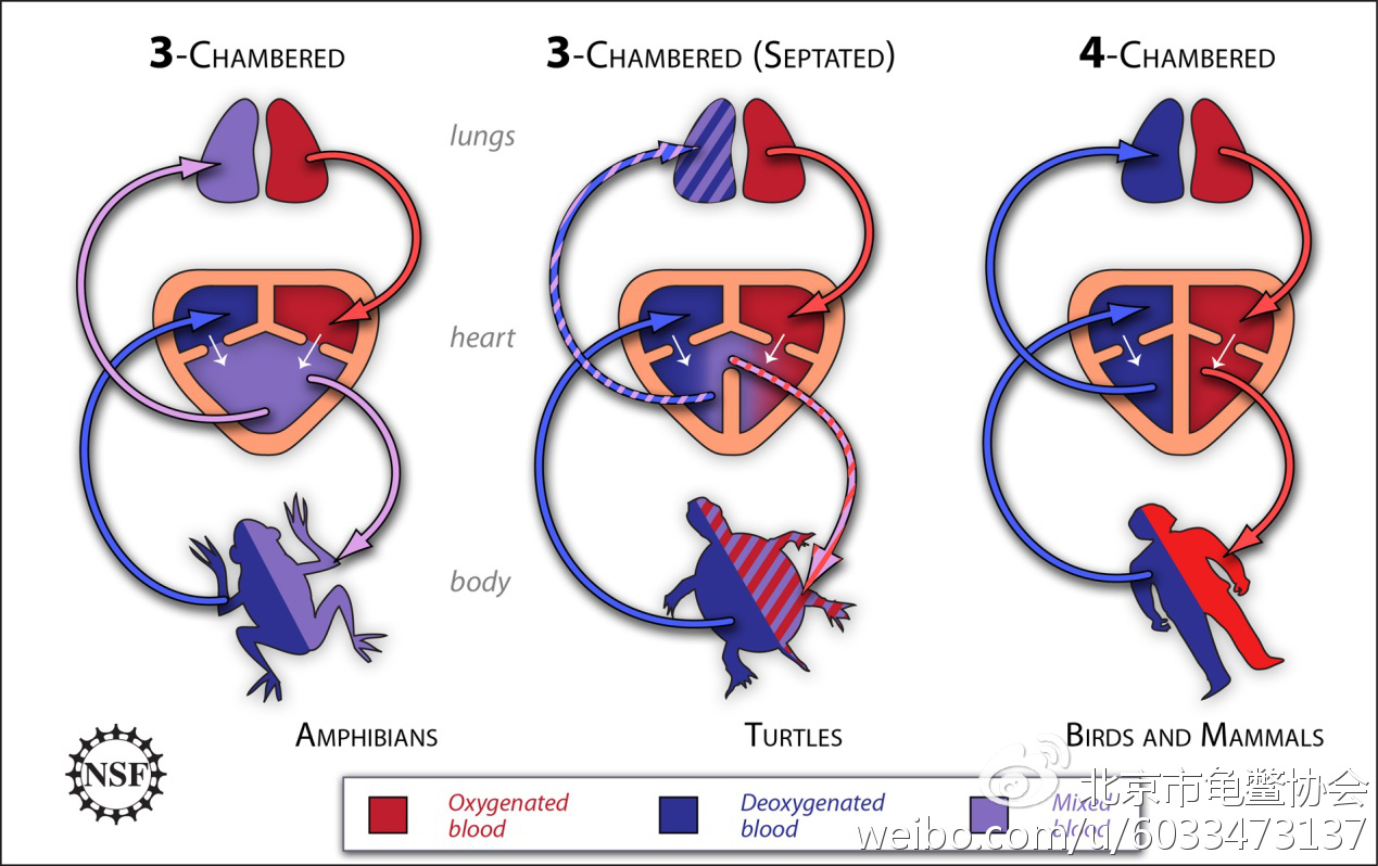 两栖类、龟类、鸟类哺乳类心脏结构与肺循环差异,红色为富氧血,蓝色为缺氧血,紫色为混合血。龟类由于具备不完整的心室纵膈,比尚无心室纵膈的两栖类能够将富氧和缺氧血分流至适当的动脉管路