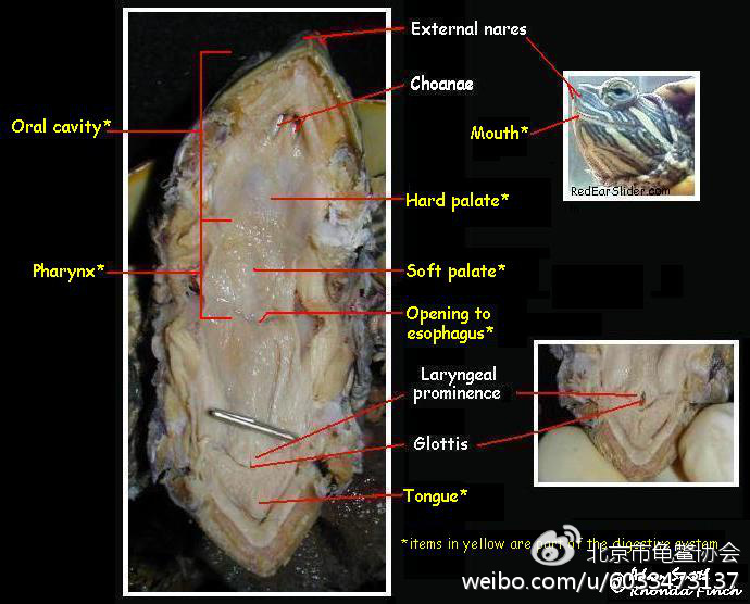 龟类的上呼吸道解剖图,其中Choanae即为鼻后孔,Glottis为声门