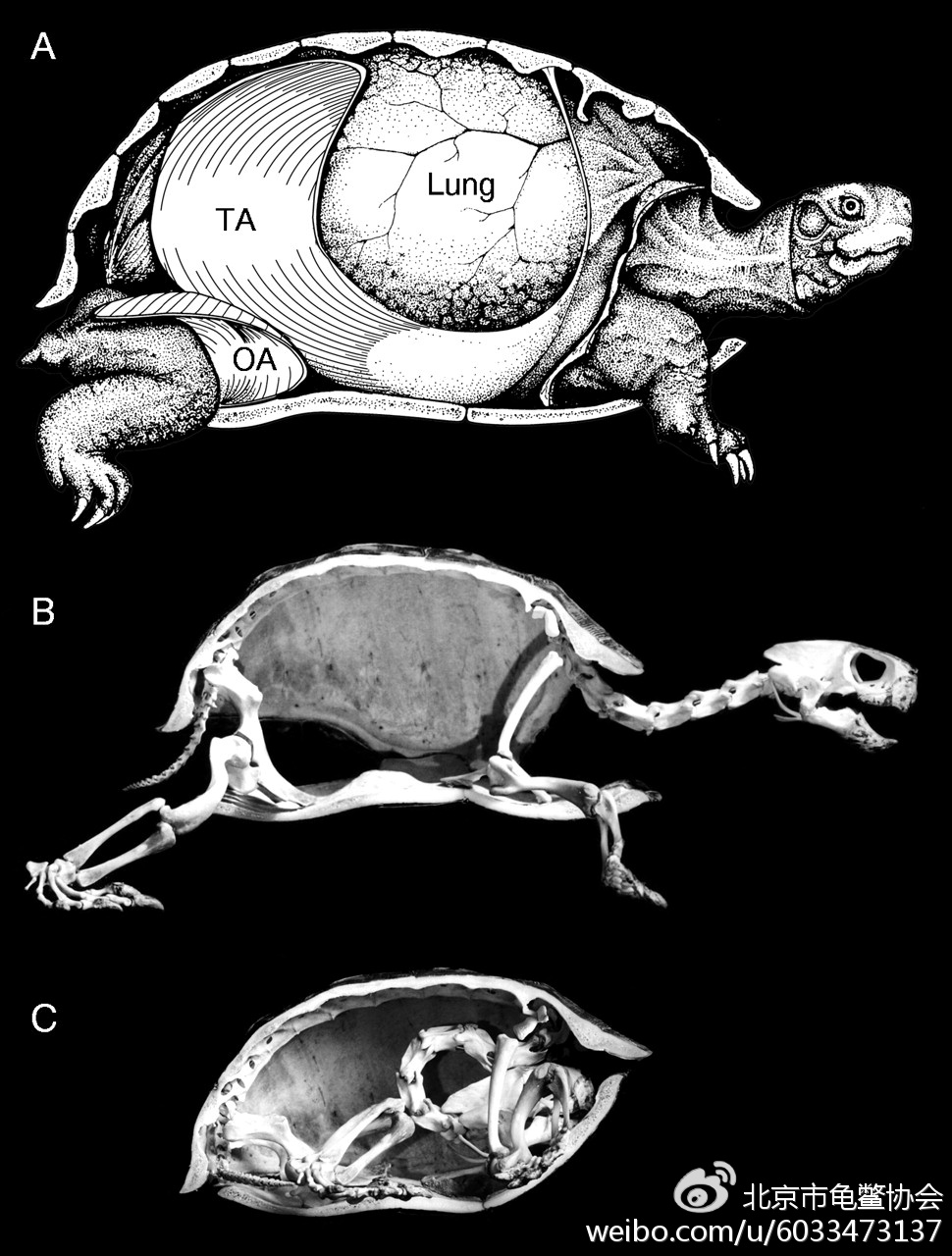 纵剖图显示龟类四肢及头部在伸展与完全蜷缩状态下体腔容积(肺容积)的改变