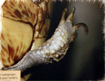 过长的脚趾可能会卡到石缝里导致整个脚趾断裂,严重的个例会导致无法正常行走。修剪脚趾必须小心,只能修剪到完全角质化的部位,往上则会伤到趾甲内的“活肉”,龟会感觉疼痛并流血。不幸的是,增生脚趾的“活肉”部分也会更长,可以用强光来分辨,”活肉”部分是透光度低,角质化部位透光度高。间隔几周修剪一次,直到脚趾缩短到合适的长度。