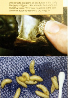 箱龟经常被这两种苍蝇侵扰,绿蝇在皮肤上产卵,幼虫则会在在皮肤上咬出一个洞,在洞里进食组织和成长。
