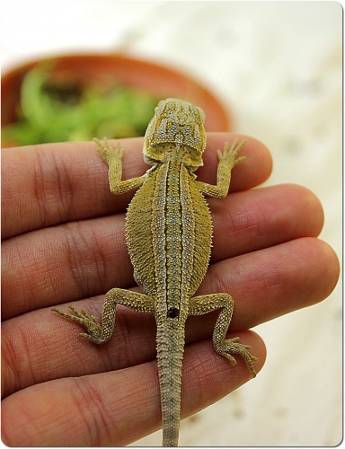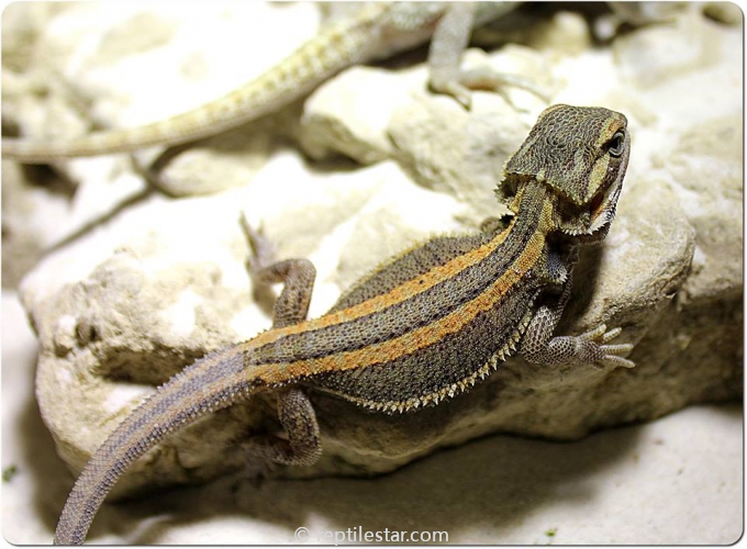 标准:German Giant基因严格意义上来说是由中部鬆獅蜥(Pogona vitticeps)和他的亲戚东部鬆獅蜥 (P. barbata)杂交而成的子一代-F1。