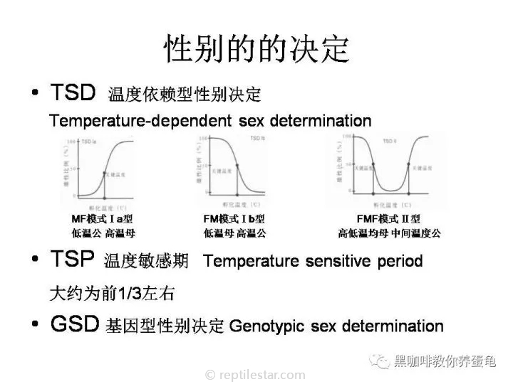 大家可以看PPT上的TSP,温度敏感期,有些文字介绍说温度敏感期为前1/3左右。例如,剃刀的孵化周期差不多3个月,那么第一个月的温度就是决定性别的温度,这时的温度高,出壳的母的,温度低,出壳的公多。如果正在一个临界温度点,那么出来的公母比例是类似的。