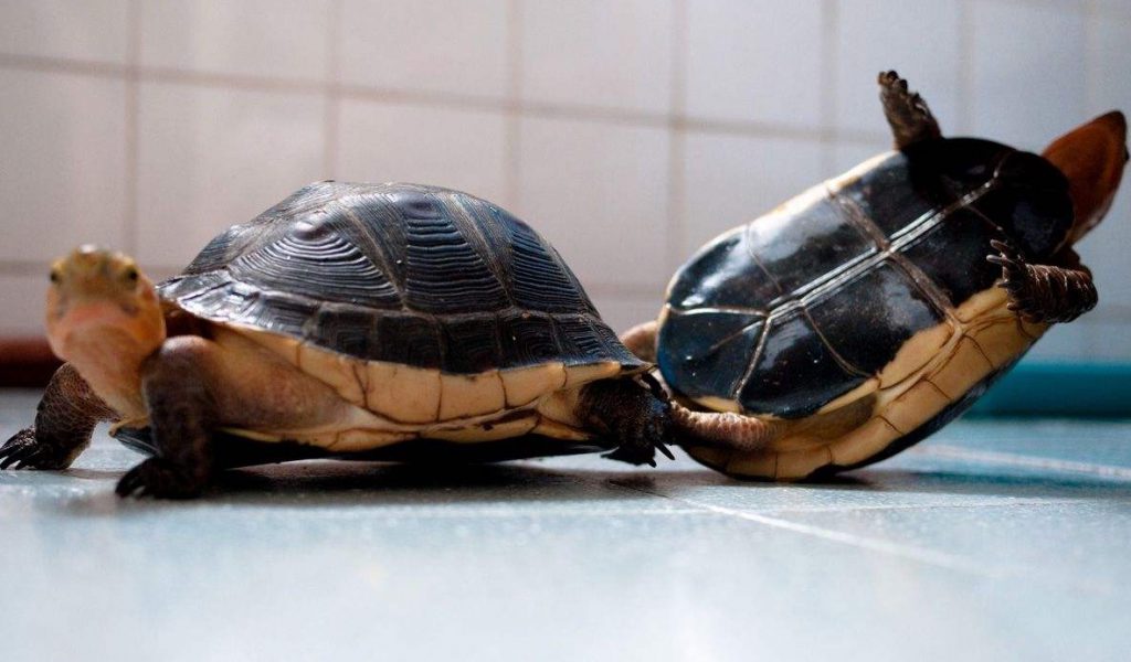 有一对年轻的雄龟和雌龟,分别来于3年前和5年前,它们几年来都生活在高等学校教室中的玻璃缸里,底下铺的是阿斯特拉草皮(“这易于打扫。”)它们都发生了爪甲脱落(有一只龟的爪甲更是所剩无几),患上了脱水和营养不良。每天涂抹磺胺嘧啶银软膏治愈了它们腐烂的肢体,而健康饮食和户外的生活场地则解决了其余的所有问题。