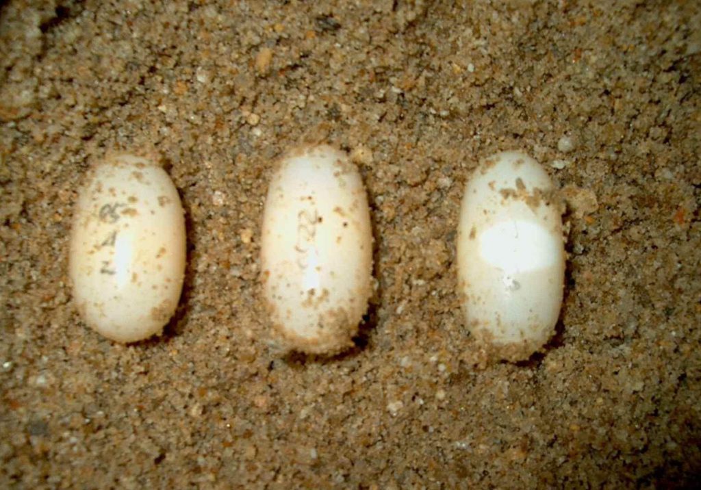 测量了8枚有繁殖能力的龟卵,其平均长度为50 ± 2毫米,宽度为22.5 ± 5 mm,重量为18.0 ± 0.5克。有繁殖能力的卵外观呈白垩样,过几天后,卵的中部会有一条白色的带子;很少有通体呈白垩样的。