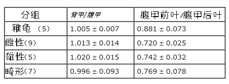 一般来说,背甲的长度和腹甲的长度之比略高于1,腹甲前叶和腹甲后叶的比例大约在0.7,稚龟和畸形要略高一些。