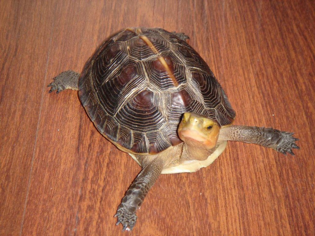 2年前别人给他一只雌性的幼龟,外形丑陋,患上了“宽边帽综合症(sombrero syndrome)”,这是饲养在室内,和只投喂面包虫与从超市买来的杂和菜所造成的典型病症。经过2年的室外生活和营养丰富的饮食,现在她活得非常好,并能绕着院子奔跑。