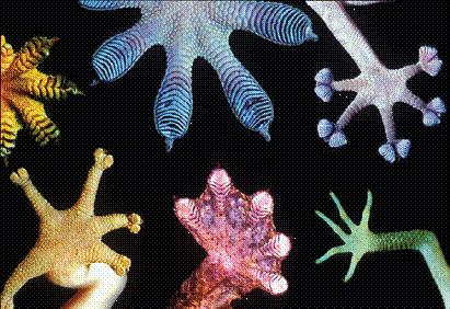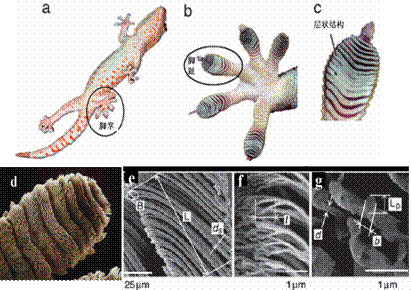 守宫这种特殊的多分级黏附系统结构,特别是其最小黏附单元达到纳米量级,保证脚掌能轻易地与各种表面达到近乎完美的结合。