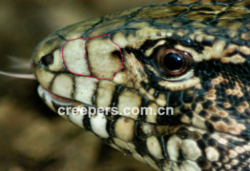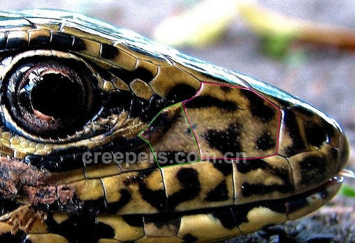 哥伦比亚黑白泰加长有单块无颊鳞 (红线圈出的部分)。切勿将绿线圈出的部分也当作是无颊鳞,它的上沿并不和吻顶的鳞片接壤,因此不是无颊鳞。
