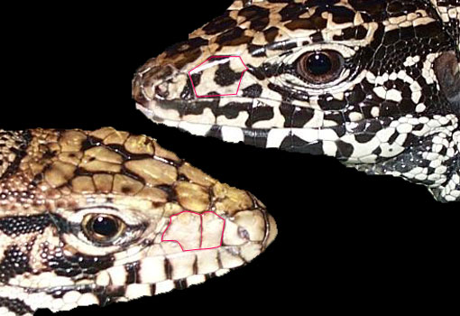 区别泰加品种的关键在于无颊鳞的数量。那什么是无颊鳞呢?无颊鳞是位于后鼻鳞 (鼻孔后侧的鳞片) 和眼前鳞 (眼前部的鳞片) 之间的鳞片。有三种泰加 (阿根廷黑白泰加,红泰加和黄泰加) 长有两片无颊鳞,它们的性情更加温和,因此比较适合当宠物来饲养,它们通常都更昂贵一些。下面我们来一一认识主流的泰加品种。