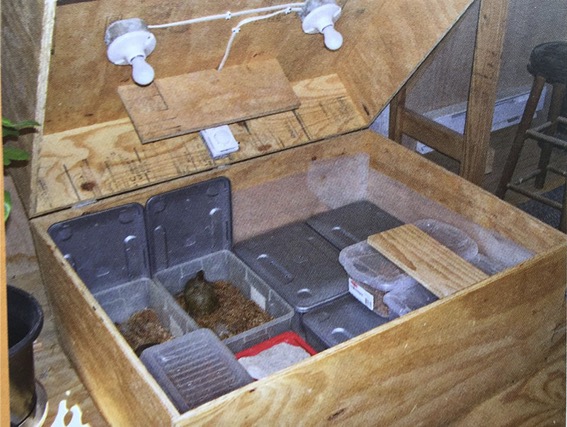 笔者的箱龟在春夏秋生活在户外,但是过冬是在室内,能更容易的监控它们的健康状态。笔者用木头做了一个大箱子,并且每只龟享用单间,还提供了加热设备来应对最寒冷的时候,这是因为她所在地冬天通常会低于零下不少。详细建造过程就不翻译了,图片一目了然。