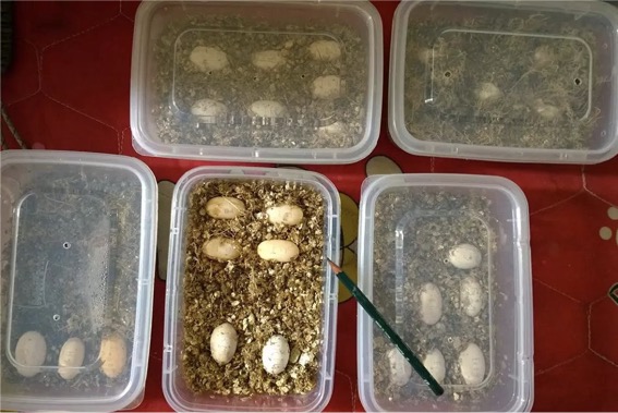 作者的孵化方式我没试过,我都是用蛭石,也可以混点苔藓,比较随意。开水烫过后,用最大力挤干,小盒子四周及顶部打一个小孔,放入蛋埋一半,然后就不管了,没出过啥问题