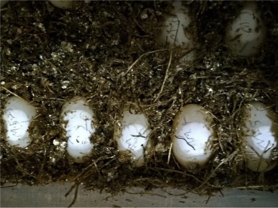 在发现蛋之后用铅笔在顶端标记,始终保持标记点朝上,即使在孵化过程中检查也需要很注意这个,因为胚胎在卵里发育有特定的方向,转动会造成灾难性的结果。不要用介质把蛋覆盖完,露出一半。