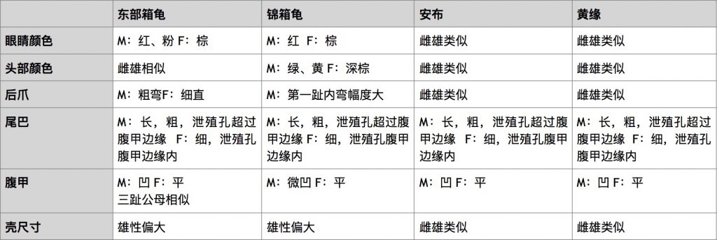 第二性征通常在腹甲长度在9cm左右显现出来。不过根据个体差异有些依然很难鉴别,下表列出部分品种鉴别雌雄的特征。