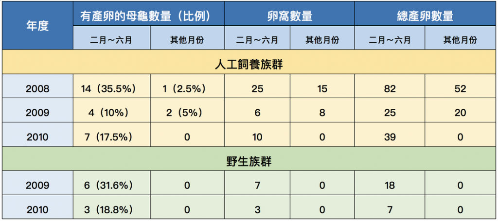 然而人工飼養族群則是有不少龜卵是在六月份以後產下的。