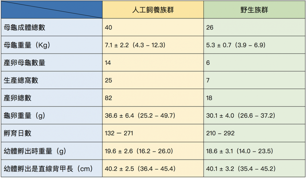 人工飼養的繁殖母龜個體重量為 7.1 ± 2.2 Kg(4.3 – 12.3 Kg ),野生的母龜個體之重量則是 5.3 ± 0.7 Kg(3.9 – 6.9 Kg),(表二)