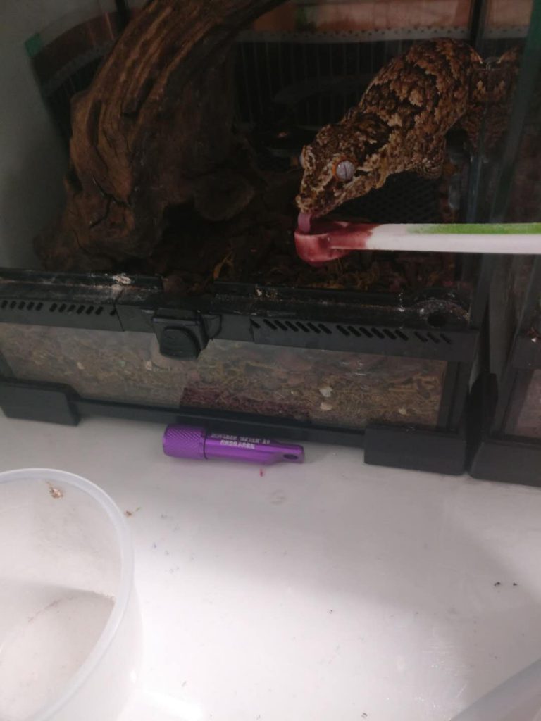 有时候像盖这类更偏爱果泥的R属守宫,需要极大的耐心,只要它肯舔,就伺候着它舔吧,有的甚至要舔10分钟之后,才会愿意开金口咬住活饵!