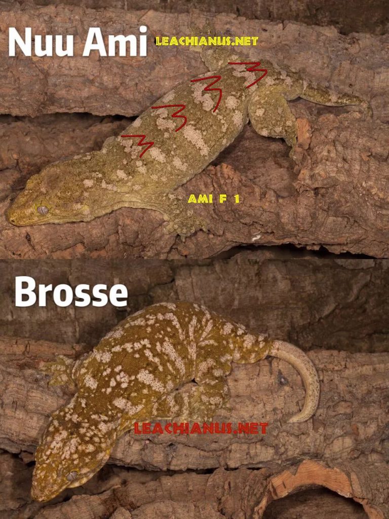 Nuu Ami 与 Nun Ana 非常相似,他们的花纹很多变,底色多为绿色,黄绿色夹杂着暗纹,身上布满粉白色条纹,大多数个体背部中央的花纹呈整齐明显的”W“图样(但我觉得大多数支岛巨人都是),也可能是说横纹比较整齐。但随着年龄增长花纹会变得不那么清晰,逐渐被红黄色斑点与雪花状的色块取代。由于Nuu Ami花纹体色多变,因而经常用于与主岛混血,生成体色鲜艳的大块头。